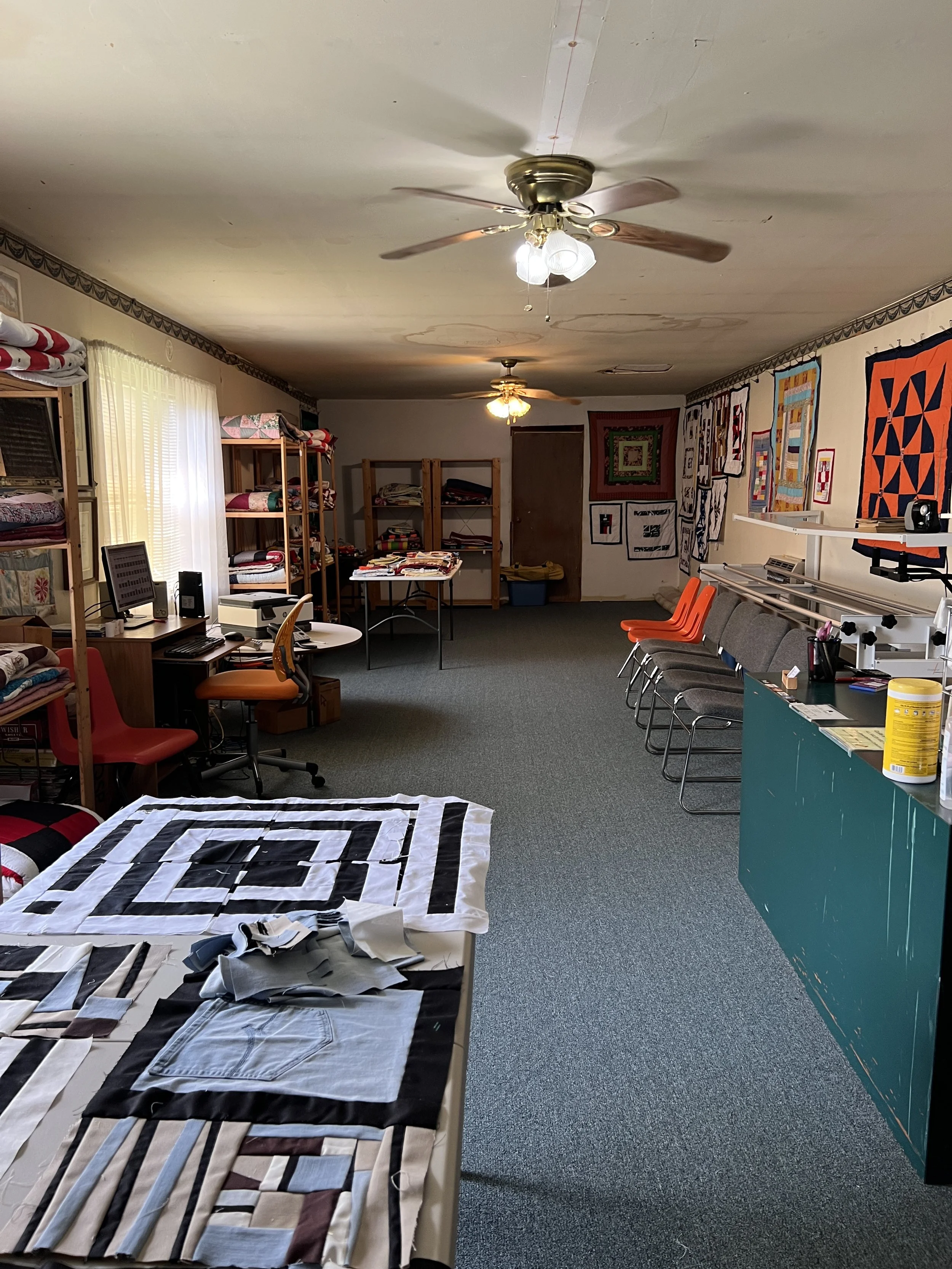 Inside the Quilt Collective, I was immediately drawn to the textiles and in progress quilting scattered throughout. In a nod to modern scraps and repurposing material, I saw bits of jeans reworked into patchwork, and strong quilt blocks built in the composition of color blocking. These current pieces acknowledged the past, but definitely established themselves as representing the abundance of material available today. On the walls hung calendars, framed photos, and posters of the masterpieces that came before. I knew I stood in a place that magic had touched - and yet I looked around further. The building that so reveres its history as being a home to quilters is slowly becoming dilapidated, with water damage clearly affecting the roof and interior ceiling. The practice of sustainability is alive and well - but now fast fashion jeans with spandex threads are used in the place of all cotton denim, creating a distortion of the quilt block shape it should structure. An old tv with a fuzzy picture drones on in the background. Magic has certainly been here, but the culture of the present is reinforced in various corners of the room; it reveals itself in how things aren’t mended so cleanly, or the loss of quality of the fibers in which we clothe ourselves.